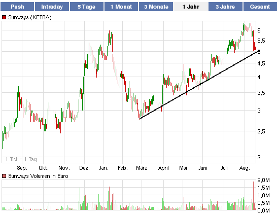 Es ist nicht davon auszugehen, dass Sunways noch deutlich weiter fällt, denn um 5€ ist eine sehr starke Unterstützung und zudem befindet sich Sunways im Aufwärtstrend, so dass Sunways zumindest nochmal in die Nähe der alten Höchsstände gehen dürfte.