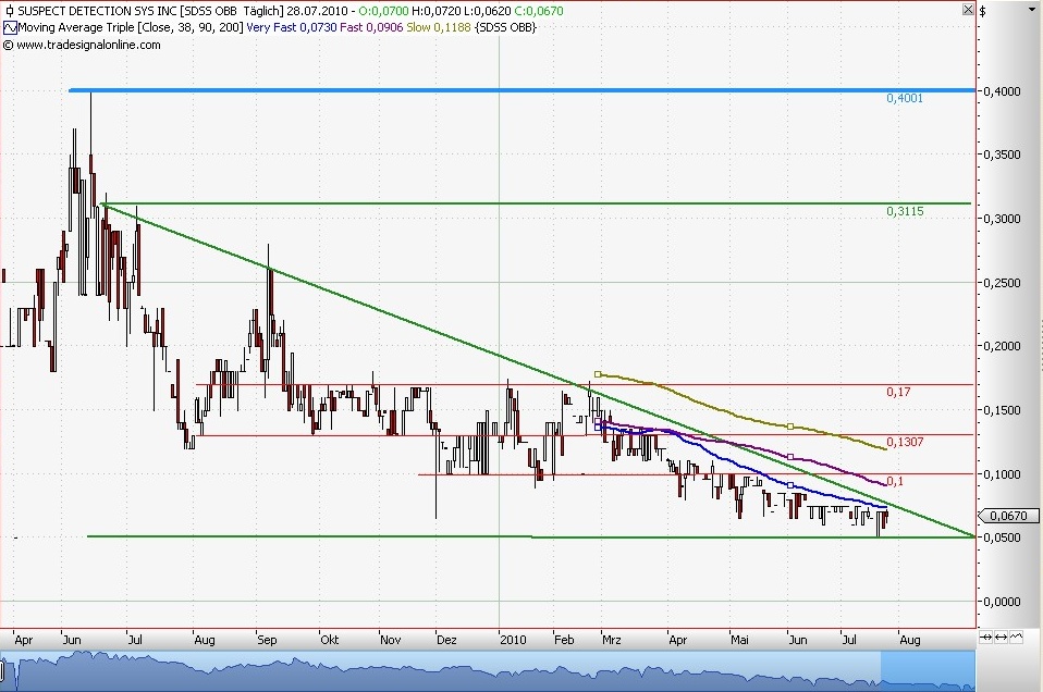 Mit dem grünen Z im Chart ist das Ausbruchniveau angedeutet, das sich innerhalb eines Jahres aufgebaut hat, es könnte bis 0,31$ also um 0,26$ vom Heutigen Start-Kurs aus ausbrechen wenn entsprechende Triebkraft den Kurs unterstützt. Auf dem Weg dorthin sind drei signifikante Widerstände zu überwinden, die dem Kurs im unteren Bereich entgegenstehen. Natürlich werden sie wenn sie vom Kurs überschritten werden, sofort zu Unterstützungen. Sie liegen von unten nach oben bei 0,1$ Nummer1, 0,13$ Nummer2 und 0,17$ Nummer3. Weiter nach oben sind weitere Widerstände wie der bei ca 0,22$-0,23$ oder der bei 0,26$ , geradezu ein Turm, zu sehen. Der letzte Widerstand ist für jeden ersichtlich die Marke von 0,40$, deshalb ist diese Linie bold blau gezeichnet. Nach ihr kommt nämlich nichts mehr was den Kurs aufhalten könnte, ausser den Fibonacci Linien die bei 33%/50%/66% unsichtbar auf den Kurs warten um ihn aufzuhalten, dabei ist die Grundlinie dann die 0,40$. Im unteren Bereich sind auch noch die 38Tagelinie (blau), die 90Tagelinie (violett) und die 200Tagelinie (braun), weitere Hürden die der Kurs überwinden muß bevor es Bergwärts geht. Ein Charttechnisch klares Bild ohne großen Interpretationsbedarf. Jeder kann erkennen welche Anstrengungen von den Marktteilnehmer an welchen Stellen des Kursniveaus geschultert werden müssen. Wie McDonald schon sagte: DIE PARTY KANN LOSGEHEN