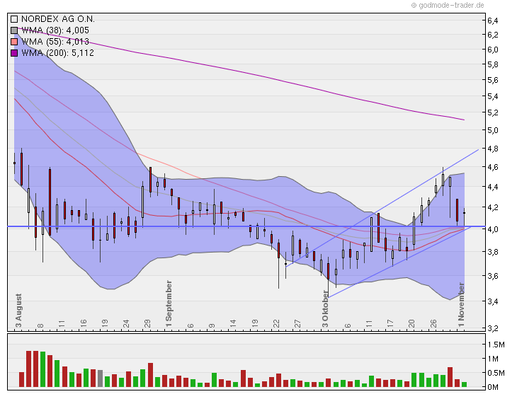 Gestriger Boden bei 4 würde wieder bestätigt (Doppelboden!). Sieht bullish aus und riecht auch danach. Dort bilden die 20-Tag-Linie (das Mittlere Bollingerband, die 38-Tage-Linie und die 55-Tage-Linie, eine horizontale Linie die zudem eine psychologische Linie ist wie auch eine nahe gelegene untere Aufwärtstrendkanallinie eine meiner Meinung nach äußerst starke Mehrfachuntertützung!