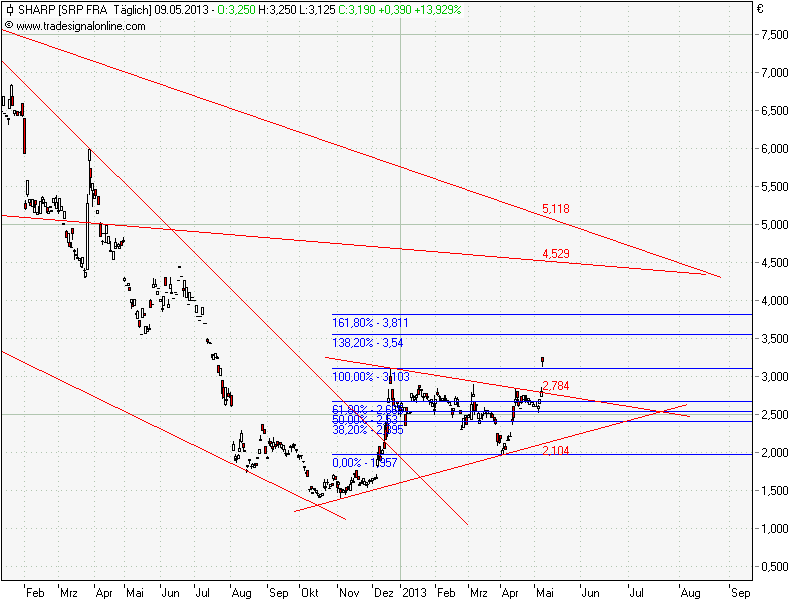 Eine Investition in die Aktie von Sharp ist kein Selbstläufer. Als Anleger braucht man wahrscheinlich gute Nerven. Kurssprünge im zweistelligen Bereich können vorkommen. Nach der starken V-Umkehr hat sich eine bullische Flagge ausgebildet, deren Auflösung zum Erreichen des ersten markanten Widerstandes führen sollte. Dieser liegt bei 4,20 Euro. Wird dieser Bereich überwunden, sind Kurse von 7 und später 10 Euro möglich. Die Chancen sind also gigantisch. Voraussetzung ist natürlich, dass Sharp nicht in die Pleite geht. Betrachtet man den Verlust 2012, dann kann man daran schon zweifeln. Es sieht aber schlimmer aus als es ist. Der operative Verlust ist weniger negativ als der operative Verlust 2009. Dass der Nettoverlust so viel höher ist als vor 3 Jahren liegt an außergewöhnlichen Belastungen, die auf die Restrukturierung zurückzuführen sind. Desinvestition, Abschreibungen, Abfindungen etc. haben zu Sonderbelastungen von über 300 Milliarden Yen und einem Nettoverlust von 350 Milliarden Yen geführt (ca. 3 Milliarden Euro). Ein Großteil des Schmerzes ist damit vorbei. Es ist zudem ermunternd, dass nach der großen Absatzschwäche die Verkaufszahlen wieder anspringen. Nicht zuletzt die Unterhaltungselektronik, die noch 40% des Umsatzes ausmacht, konnte sich stabilisieren. Sharp verlässt sich allerdings nicht darauf, dass alles wieder einfach so gut wird. Es wird kräftig umgebaut, auch um vom Heimatmarkt weniger abhängig zu werden. Der Umsatzanteil liegt hier bei über 60%. Innerhalb weniger Jahre will Sharp den Anteil auf 40% durch Wachstum im Ausland verringern. Bereits 20% kommen aus China. Sollte es nicht zu unerwartet heftigen politischen Auseinandersetzungen zwischen China und Japan kommen, kann die Expansion funktionieren. Zudem werden neue Sparten aufgebaut bzw. erweitert. Dazu gehören intelligente Kommunikationsnetzwerke, erneuerbare Energie und Gesundheitswesen. Die Chancen stehen gut, dass Sharp nicht in die Insolvenz gehen muss. Riskant ist das Investment natürlich dennoch und sollte nur in Zusammenhang gesehen werden. Als alleinstehendes Investment mit hohem Anteil am Depot taugt Sharp nicht. Bis sich der mögliche Turnaround in den Zahlen zeigt, kann noch eine ganze Weile vergehen. Bis dahin wird der Aktienkurs stark von kurzfristigen Meldungen abhängen. Haupttreiber ist derzeit die Cashposition. Vor allem davon wird abhängen, ob Sharp weiter alleine existieren kann. Nach eigenen Angaben will das Unternehmen notfalls auch einen Zusammenschluss mit anderen Firmen evaluieren. Solche Gerüchte treiben den Kurs erheblich. Zuletzt konnte die Aktie aufgrund eines solchen Gerüchts 10% an einem Tag zulegen. Ebenso wie kürzlich noch Nokia liegt Sharp so weit am Boden, dass die meisten Nachrichten positiv aufgenommen werden.