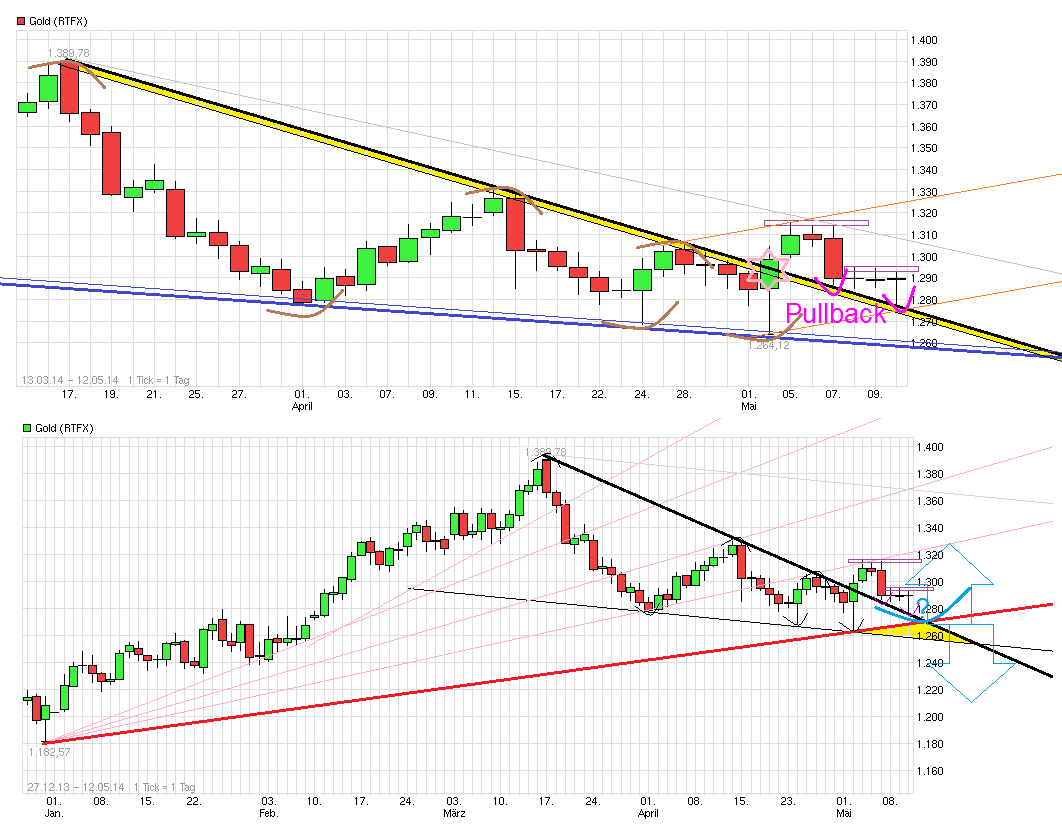 korregiert hat. Bislang ein exakter Pullback an das Dreieck aus dem man jüngst ausbrach. Eine Rückkehr wieder dort hinein wäre ein Zeichen die Bullen haben doch keine nachhaltige Kraft nach oben und sind schon zufrieden immer wieder einen nachhaltigen Rutsch unter 1275/80$ zu verhindern. Bin mal gespannt wie sich die Situation auflösen wird die kommenden Tage. Morgen gibt es ja noch die Zinsentscheidung der EZB. ( http://www.godmode-trader.de/artikel/...mt-der-schwere-gustav,3732079 ). Könnte gegen 13:45 bei der Bekanntgabe etwas Zuckung beim Goldpreis erzeugen wie auch die PK von Draghi gegen 14:30 nicht völlig gleichgültig aufgenommen werden sollte. Den ganzen künstlich aufgebauschten Kram um die Ostukraine sehe ich weiterhin als Randzirkus an. Für die Weltwirtschaft und die Börsen nicht so wirklich wichtig und eher dem Amis willkommen, um so das unschöne Thema NSA und TTIP aus den Schlagzeilen zu bringen. Man sieht ja auch, daß der Goldpreis jetzt ca. 100 $ tiefer steht als zum Zeitpunkt als die Krim den Anschluß an Rußland beschloß. Der Dow ist aktuell nur ca. 1% von einem neuen Allzeithoch entfernt. Angst sieht eigentlich anders aus. Das alles juckt nicht wirklich die wohlhabende Welt was in einem fernen Armenhaus am Rande von Rußland passiert. Die meisten Amis wissen nichtmals wo die Ukraine überhaupt liegt, geschweige denn die Ostukraine. ( => http://www.handelsblatt.com/politik/international/...ien/9743002.html => "...Für die einen liegt sie in Alaska, für die anderen an der Grenze zu Nordkorea, im Urwald von Brasilien oder auf dem australischen Kontinent: Die Ukraine. Nur einer von sechs befragten US-Bürgern war in der Lage, den geopolitischen Brennpunkt in Osteuropa richtig auf einer Weltkarte zu lokalisieren. Die anderen lagen mehr oder weniger heftig daneben. Der Median der Abweichung lag immerhin bei rund 2900 Kilometern (1800 Meilen) ...Demnach weiß einer von vier US-Bürgern nicht, dass die Erde um die Sonne kreist.....Immerhin fast 50 Prozent der Amerikaner halten Astrologie für eine Wissenschaft. Vielleicht wissen die Sterne ja auch, was wir mit der Ukraine machen sollten...."). Da gibt es Jahr für Jahr Tag ein Tag aus massig andere Konflikte auf der Welt wo man froh wäre es es wäre nur so "schimm" wie in der Ost-Ukraine. Man denke nur an Syrien, Süd-Sudan etc.. Sichere Häfen werden von Anlegern ja nicht wirklich gesucht. Die klassische Fluchtwährung US-Dollar ist in den letzten Wochen nicht fester geworden, sondern das Gegenteil ist der Fall ( und wird Draghi doch zum handeln bewegen, um die zunehmende Eurostärke einzudämmen?). Und es kommt Gold nicht wirklich nachhaltig dynamisch in die Hufe nach Norden , da weiter keine echte Inflationsgefahr zu sehen ist (eher noch Deflationsängste) und mit dem Tapering der FED sich schon abzeichnet, daß die Liquiditätsmaßnahmen der FED ihren Höhepunkt überschritten haben sollten. Die Produktionskosten von Gold liegen bei roundabout 1250$. Von daher vielleicht nicht so überraschend, daß es hier nicht wirklich nachhaltig darunter gehen will. Die beiden Absacker unter 1200$ auf ca 1180$ (Ende Hj1/13, Ende Hj2/13) waren ja rein dem stichtagsgerechten Windowdressing geschuldet, weil da instit. Fondanleger Verluste kurz kaschieren wollten. Da ging es nach dem Stichtag jeweils wieder klar über 1200$. Es fehlen halt wirklich nachhaltige Impulse, um Gold aus dieser Seitwärtspendelei von 1250/1300 +/-100$ zu bewegen. Es wird halt mehr getradet auf kurze Sicht und weniger auf längere Sicht ernsthaft investiert. Es scheint niemand der Big Player wirklich große Eile zu haben in Gold verstärkt wieder zu investieren solange sich nichts grundlegend an der gegenwärtigen Situation ändert (moderate Erholung der Weltkonjunktur ohne Inflationstendenzen bei weiterhin sehr niedrigen Zinsen). Mir fehlt momentan eine klare mittelfristige Trendrichtung bzw. ein Signal einer größeren Trendänderung. Daher bin ich auch weniger aktiv im Bereich Gold als noch vor 1-2 Jahren und beschränke mich auf gelegentliche kleine Trades, wenn gewissen Chartkostellationen ein interessantes CRV anzeigen. In übergeordnet klar fallenden oder steigenden Märkten läßt sich besser traden.