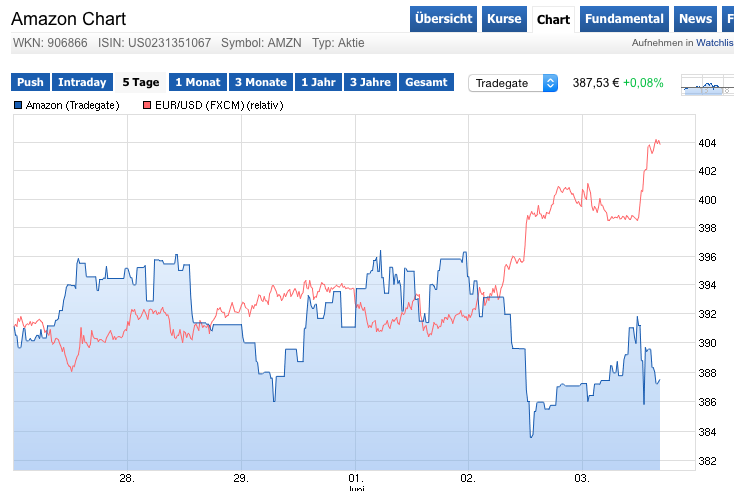 ...die Aktie an den US-Börsen steigt? Hier können wir (leider) sehr schön den Effekt des sich abschwächenden Dollars gegenüber dem Euro verfolgen.