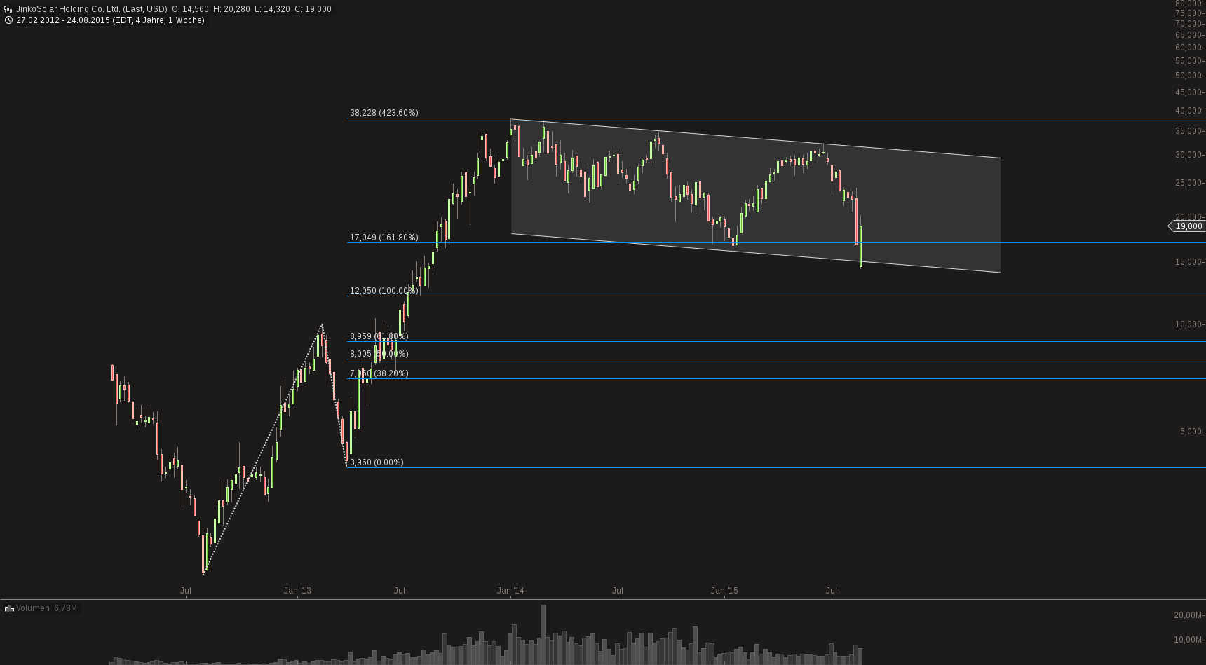 Die letzte Abwärtswelle der Jinko vom 18.-24. August (von 24USD auf 14,30USD) fand Montag vorerst ihr Ende. Der Kurs ging wie erwartet in eine technische Gegenbewegung über, hat zwischenzeitlich 61,8% der letzten Abwärtsbewegung korrigiert und steht nun gewissermaßen im Niemandsland bei 19USD.