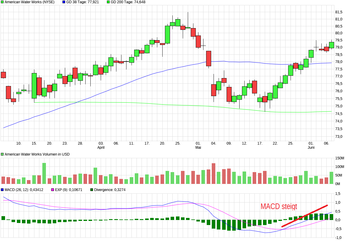 Wasser wird immer gebraucht.... Nun ist die Aktie auch noch über der 38 Tage Linie, über der 200 nun schon länger und MACD steigt.