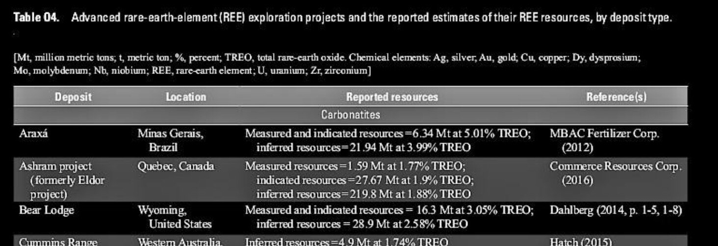 Am 19. Dezember veröffentlichte der U.S. Geological Survey (USGS) das"Professional Paper 1802: Critical mineral resources of the United States-Economic and environmental geology and prospects for future supply". Mit fast 900 Seiten ist Professional Paper 1802 das erste umfassende Update zum Thema kritische Mineralien, einschließlich Seltene Erden, in den USA seit 1973. U.S. Innenminister Ryan Zinke erklärte am Tag der Veröffentlichung des Berichts: "Es zeigt, dass die USA bei den meisten kritischen Mineralien zu 100% auf China angewiesen sind. Das gefährdet unsere wirtschaftliche und nationale Sicherheit." Die Ashram-Lagerstätte von Commerce Resources Corp. wird im USGS-Bericht auf S. 554 in Tabelle O4 erwähnt. Erweiterte Explorationsprojekte für Seltene Erden (REE) und die berichteten Schätzungen ihrer Seltene Erden-Ressourcen nach Lagerstättentyp' | Den gesamten Bericht finden Sie unter: https://pubs.er.usgs.gov/publication/pp1802