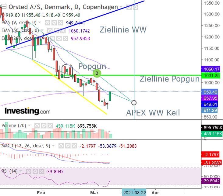 - Fakt ist, dass im Chart eine sogenannte Popgun läuft, die Kurse bis 1020 -1040 DKK, also noch mal plus 10%, triggern könnte. Popguns haben eine hohe statistische Wahrscheinlichkeit.