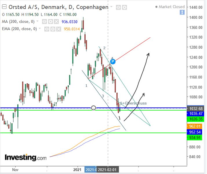 Der Wert hat heute noch ein Loch auf 912,20 – 918,4 DDK, wenn er das zumacht, und bei Orsted ist davon auszugehen, hat er die erste Konsolidierungsformation vervollständigt.