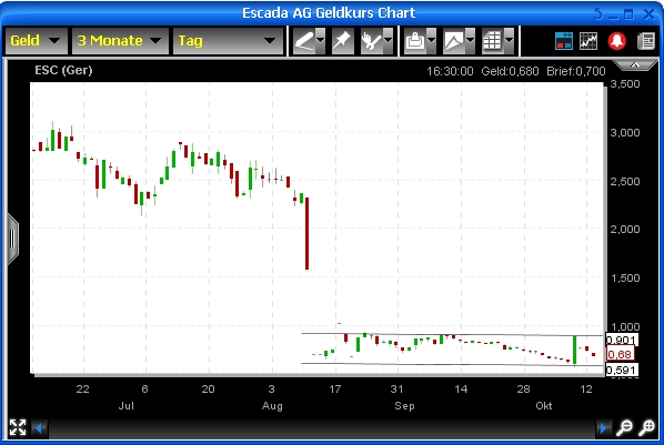 Zumindest zeigt ja auch, dass die Insider nicht bescheid wissen, was die PR-Abteilung von Escada gerade plant. Der hätte bestimmt lieber zu 90 anstelle der 59c verkauft, die Meldung kam eben erst am späten Vormittag...