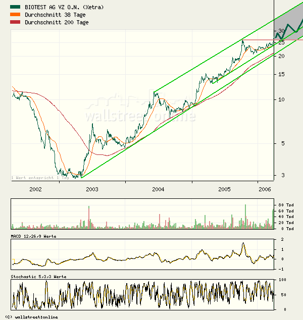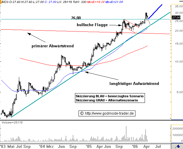 Rückblick: Die BIOTEST Aktie befindet sich in einer langfristigen Aufwärtsbewegung. Im Oktober 2005 markierte die Aktie ein neues Allzeithoch bei 26,00 Euro und konsolidierte anschließend in einer bullischen Flagge. In der ersten Woche 2006 erfolgte der regelkonforme Ausbruch nach oben. Danach ging die Aktie aber sofort in einen Pullback über. Ab Anfang Februar 2005 zog die Aktie deutlicher an. In der letzten Woche erreichte die Aktie bereits ein Hoch bei 30,00 Euro. Von diesem aus kam es zu einem Rücksetzer an das alte Allzeithoch aus dem Oktober 2005.
