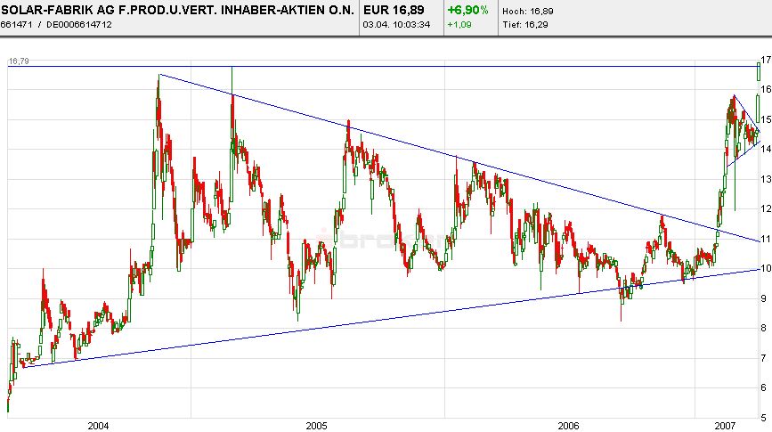 ist ist zu erwarten, dass Solar Fabrik mit äußerst positiven Zahlen aufwartet, die das Papier um 15 - 20 % steigen lassen könnten (charttechnisch). Also, es wird spannend am Freitag (Bekanntgabe der Zahlen für 2006)!!!
