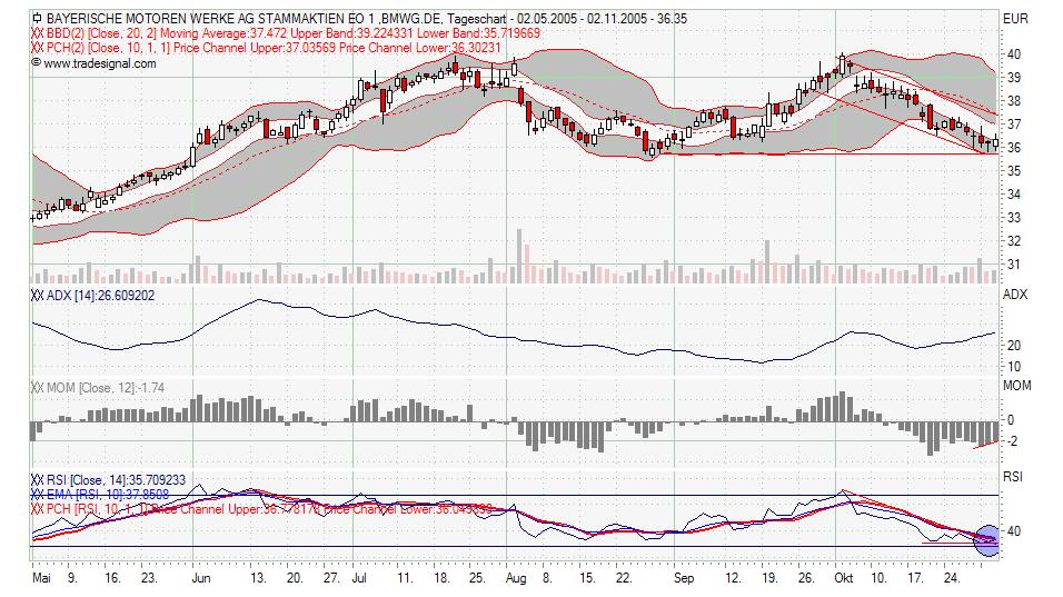 ui, BMW ziemlich schleche Zahlen vorgelegt ... Jetzt schon 2 % im Minus. Mal schauen ob die Unterstütz­ung bei 35,90 € hält. Werde heute die Chance wahr nehmen und mir Aktien ins Depot legen, letztes Jahr war absolutes Rekordjahr­ für BMW und 2005 soll so ziemlich auf dem Niveau liegen. Im Aktienkurs­ spiegelt sich das m. M. nach nicht wieder. Der Optionssch­ein hat ja noch Laufzeit und mal schauen wie die Aktie heute aus dem Handel geht!