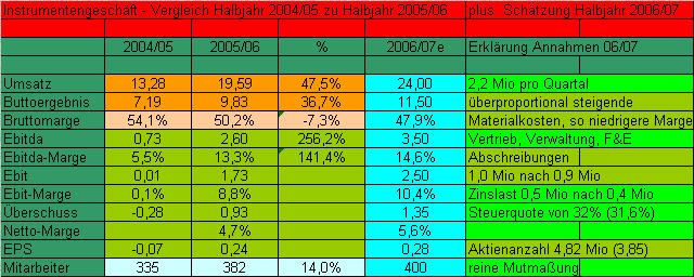 Auch dort sieht mal ebenfalls, dass ich von einer geringeren Bruttomarge (in ähnlichem Ausmaße wie beim Vergleich letztes Halbjahr mit diesem Halbjahr) ausgehe. Auch den Bereich Vertrieb,Verwaltung,F&E hab ich deutlich angehoben, und zwar eigentlich sogar überdimensional. Abschreibungen, Zinslast und Steuerquote hab ich jeweils nur ganz leicht angehoben, zumal ich denke, dass die Zinslast eher leicht sinken müsste. Auch bei den Abschreibungen besteht eigentlich kein Grund, jetzt höhere Abschreibungen zu erwarten, aber ich bin mal auf Nummer sicher gegangen. Jedenfalls würde sich trotz deutlich steigenden Aktienanzahl das EPS um 15% erhöhen, und so mein EPS-Ziel von 55-60 Cents fürs nächste Geschäftsjahr mindestens erreicht werden, vor allem weil im nächsten Jahr durch das anziehende Projektgeschäft auch noch mit kleinen Gewinnbeiträgen gerechnet werden kann. Ab den folgenden Jahren wird sich dann jedes weitere Umsatzwachstum noch stärker auf die Gewinne auswirken, da der Hebel dann noch stärker wirkt und die Zinslast weiter abnehmen dürfte. Voraussetzung dafür ist sicherlich das Umsatzwachstum im Instrumentengeschäft. Das bezweifel ich nicht. Wer daran nicht glaubt, weil er das Geschäft nicht einschätzen kann, soll eben nicht investieren. Wobei ich die Aktie bereits aufgrund der aktuellen Daten für einen Kauf halte. Denn so ein Unternehmen mit all seinen interessanten Tochterunternehmen und der Marktstellung unter Buchwert mit einem KGV von 14-17 (je nach Aktienanzahl) fürs jetzt fast abgelaufene Geschäftsjahr zu bewerten, halte ich einfach für enorm günstig. Da brauch ich nicht mal mit dem Branchenvergleich kommen.