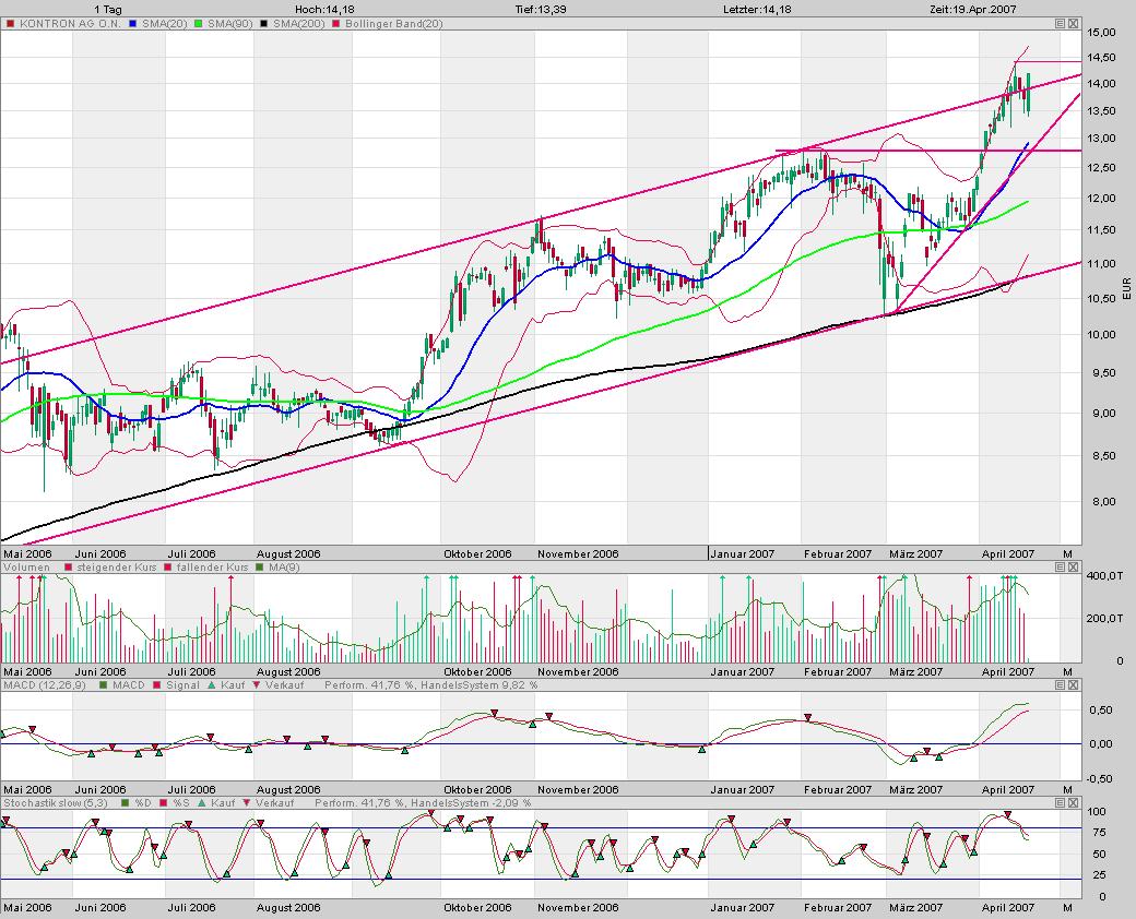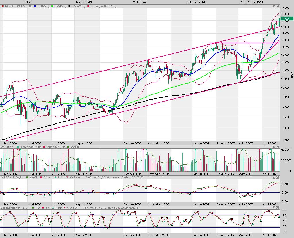 Seit mir bitte nicht böse , aber eine Aktienempfehlung gebe ich hier nicht ab, da ich kein Analyst oder sonstiges bin, desweitern habe ich mehrere Aktien, aber nicht alle laufen so gut, wie es Kontron in den letzten Monaten getan hat, hier hatte ich glück gehabt, ich habe die Aktie von Kontron, am 16.1.06 für 7,51 € gekauft und gestern für 14 € wieder Verkauft, wie Ihr sehen könnt, habe ich die Aktie über ein Jahr abgesessen, es ist nicht so das ich von heute auf Morgen direkt 100% mache.