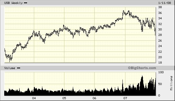Strategie: Abwarten, bis der US-Bankenindex BKX einen klaren charttechnischen Boden gefunden hat. Dann nicht die "billigsten" Bank-Aktien kaufen (in der Illusion, dass die am weitesten wieder steigen), sondern die relativen Outperformer - wie USB. Ich glaube, dass auch USB noch ein paar Dollar tiefer fallen könnte. Wenn man da knapp über 20 reingeht, macht man vermutlich nicht viel verkehrt (aktuell: 28 Dollar). (Vorausgesetzt, bei USB tut sich nich noch ein Leichenkeller auf).