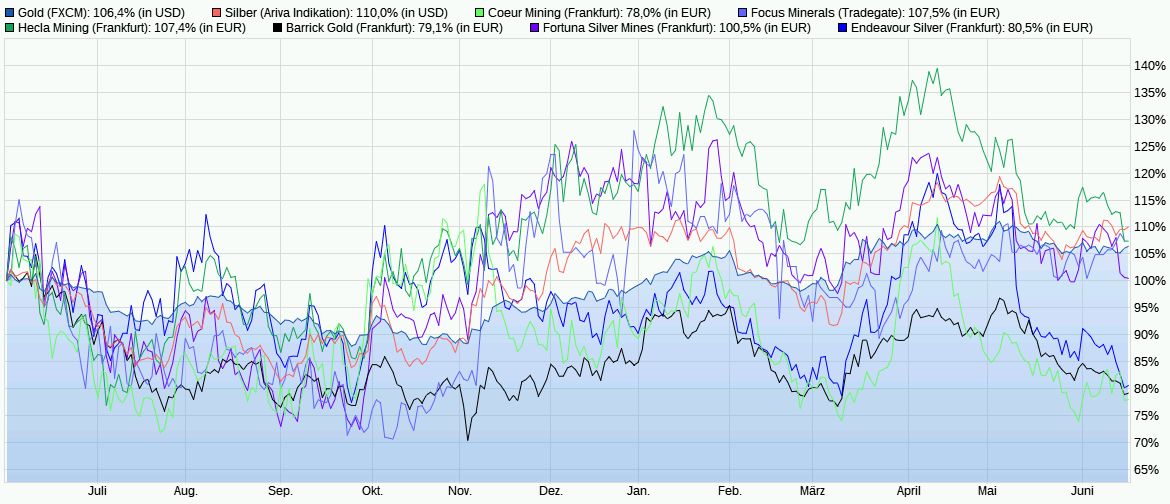 Im Chart unten sieht man diverse Aktien im Vergleich gegenüber Gold und Silber. Die stärksten Reaktionen kann man bei Coeur Mining und Endeavour Silver erkennen. Auch Hecla ist stark dabei. Wer es lieber gemütlich mag und auf Gewinne verzichten kann zieht Barrick vor...