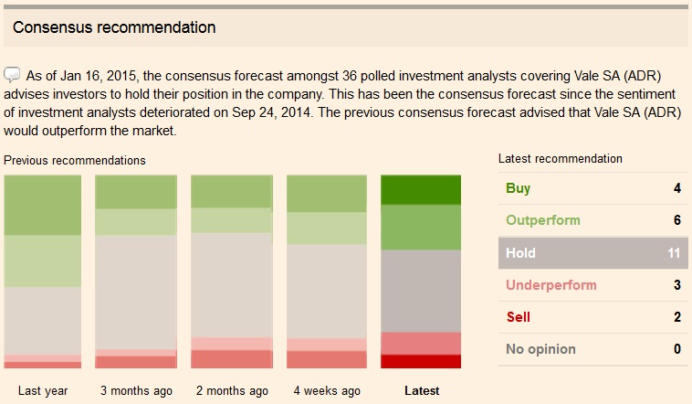 Am 16.01.2015 haben 36 Finanzanalysten, die den Wert Vale unter Beobachtung haben, ihre Prognose zur weiteren Entwicklung der Aktie abgegeben.