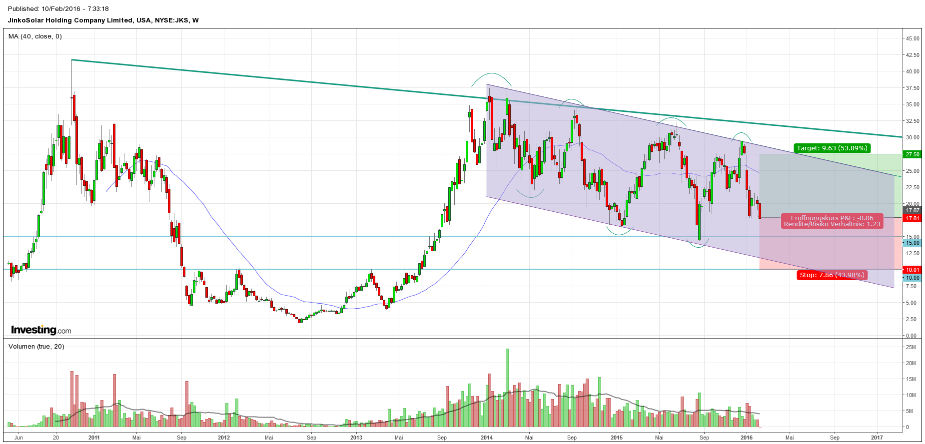 Genau aus diesen Gründen halte ich mich bei Jinko noch dezent zurück (bin aber trotzdem investiert falls es doch hoch geht, rein psychologisch bedingt) und warte auf die 10 Dollar. Damit wäre dann der extreme Anstieg von 2012 und 2013 konsolidiert und null Risiko on der Aktie. Der Weg zur 40 oder 50 wäre dann frei. Charttechnsch zumindest. Ob fundamental dann noch gerechtfertigt muss man sehen.