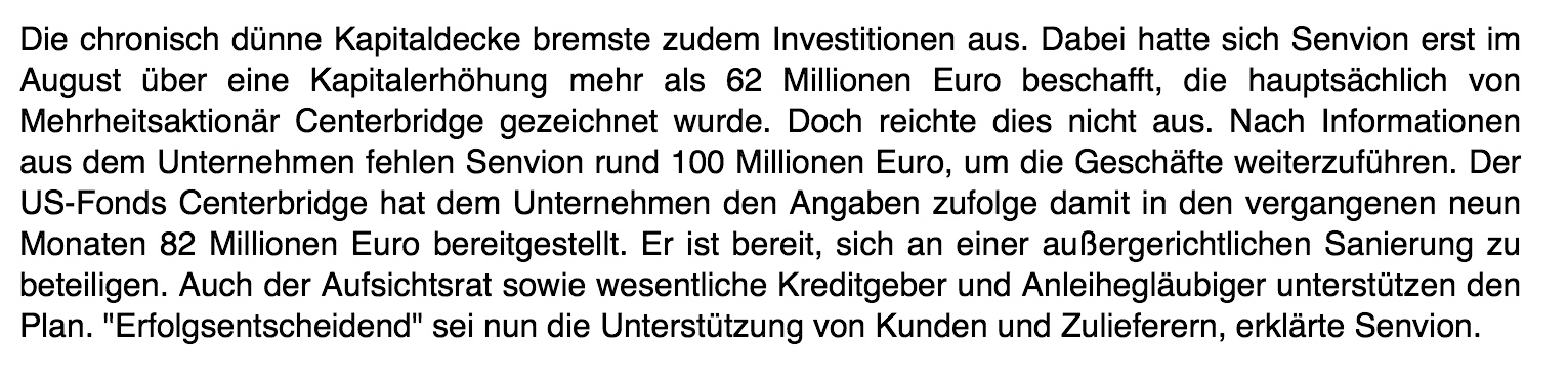 MEINE MEINUNG: Senvion geht Insolvent - einzelne Bereiche wie das Service Geschäft oder das Offshore Geschäft oder RiaBlades werden zerschlage­n und verkauft. Die Rosinen werden sich quasi herausgepi­ckt. Der Rest geht vor die Hunde. Geld was jetzt investiert­ wird, geht verloren, also würde ich keinen Cent hier investiere­n.