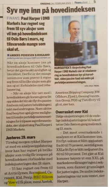 nach Angabe von Paul Harper DNB Markets wird REC Silicon (aus dem Aker Horizons Portfolio) und VOW in den OBX-Index-(Top25) zum 19.3.2021 wechseln.
