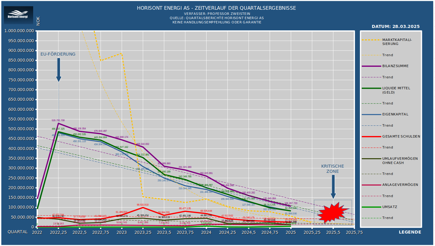 Horisont Ammoniakk hingegen wird nahezu wertlos sein, wenn niemand das Barents Blue Projekt übernimmt. Da es jedoch ein sehr großes und in der Planung fortgeschrittenes Projekt für die Energiesicherheit Europas ist, könnte es genauso gut sein, dass ein großer Player einsteigt oder es zu einem Übernahmeangebot kommt. Dann dürfte sich auch hier der Wert im Kurs widerspiegeln. Abwarten.