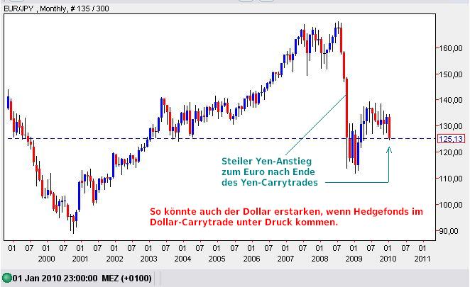 Auch ein steigender Dollar kann in der Ära des Dollar-Carrytrades ungeahnten Druck entfalten. Bislang wurde mit Dollar-Kursanstiegen nicht gerechnet, weil ja die Leitzinsen in USA noch länger bei Null bleiben sollen. Der Dollar steigt aber nun wegen Euro-Schwäche, was die Dollar-Carrytrader auf dem falschen Fuß erwischt. Die Euro-Schwäche hat ihre Ursache darin, dass Griechenland taumelt und Kritiker in Davos sich um die Euro-Stabilität sorgen: