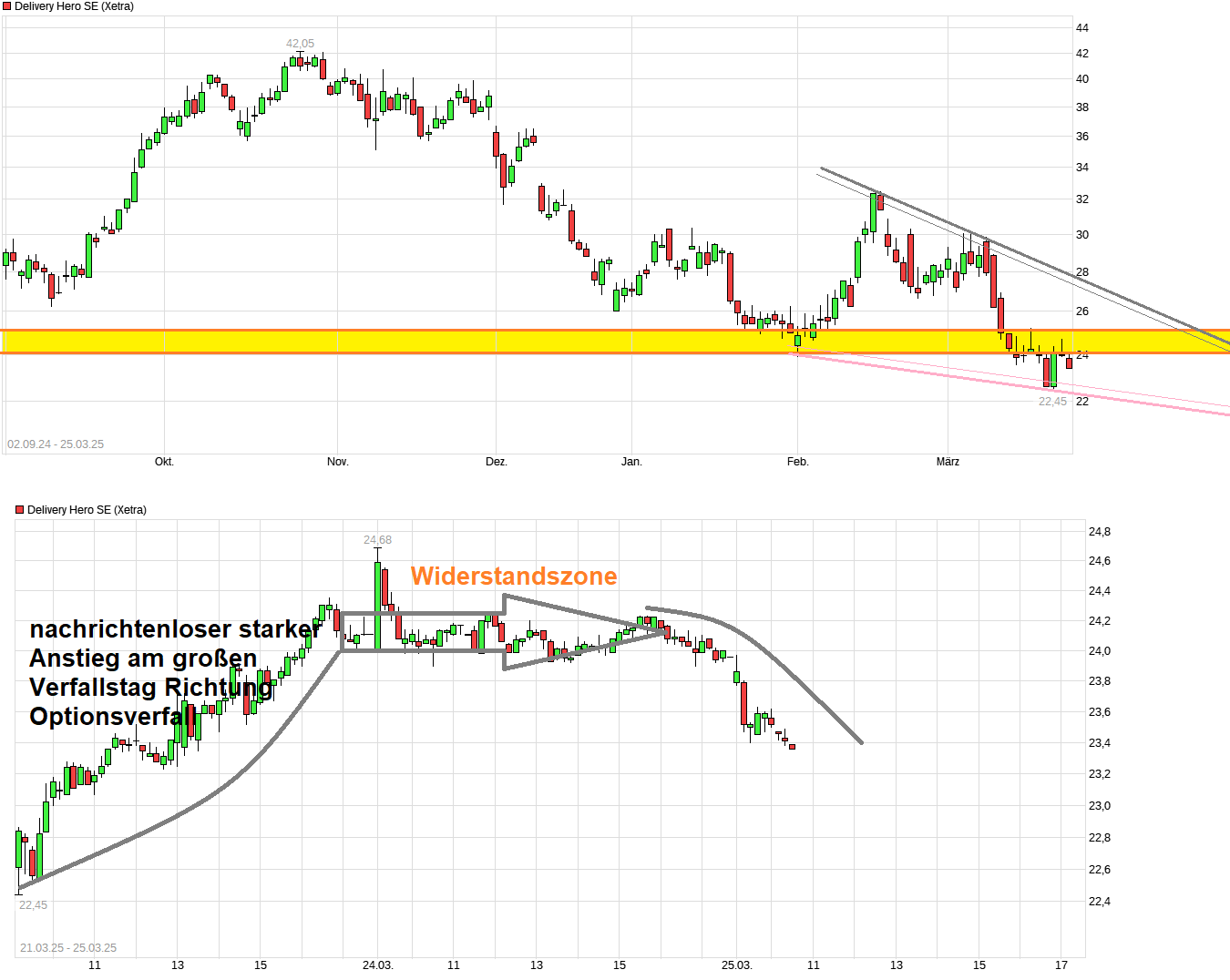 Ist also etwas tricky zu entscheiden was hier jetzt der größere Impuls war für die Reaktion. Bin trotzdem spekulativ mit einer ersten Teilposition wieder dabei, weil ich grundsätzliche denke im unteren 20er Bereich um 21/23 sollte eine Gegenreaktion möglich sein ( ca. 50% Rückgang vom Oktober-Top). Sollte es doch nochmal etwas tiefer gehen, würde ich etwas weiter nochmal nachlegen. Ich hoffe auch, daß eine mögliche Kartellstrafe hinreichend durch die Rückstellungen abgedeckt wäre und es auch helfend wäre diesen Unsicherheitspunkt wegzuhaben. Also mal schauen was ab nächster Woche weiter passiert. Man hat natürlich jetzt direkt die Region um 24,/25€ (Tiefststände von Ende Jan./Anfang Feb.) vor der Nase, die man jüngst als Unterstützung durchbrochen hatte. So etwas wird dann auch gerne mal umgekehrt zum Widerstand. Da ist bislang noch kein nachhaltige Rückkehr darüber passiert. Ist somit alles noch etwas zwischen Baum und Borke. Entsprechend ist der eingesetzte Betrag der ersten Teilposi bislang noch eher klein gehalten bis Dinge sich vielleicht etwas mehr verfestigen.