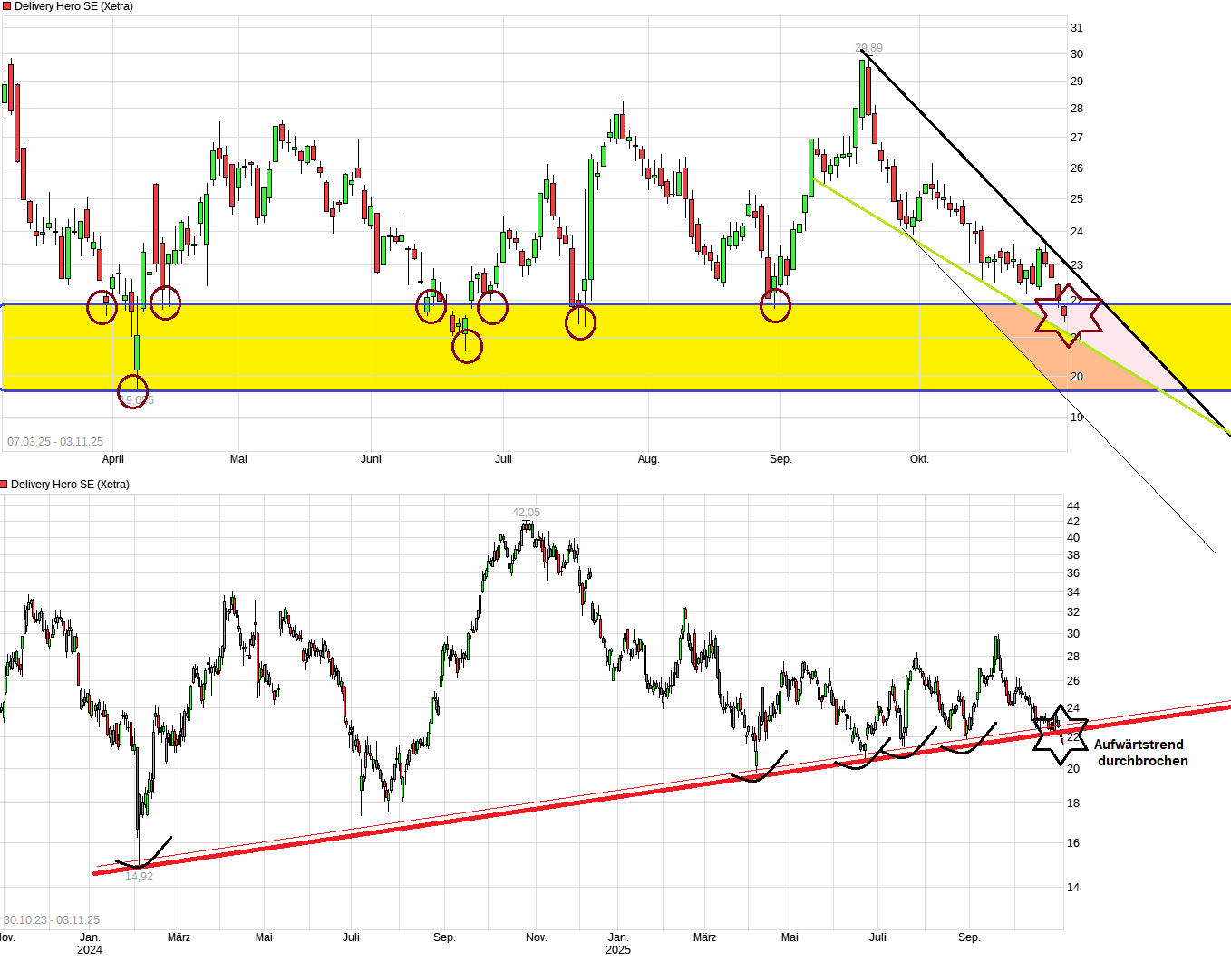 Das man nun die Jahresprognose für den Gewinn senken muß, ist auch zu einem guten Teil eigene Schuld. Schon im Frühjahr sind doch schon der US Dollar und der Korea Won deutlich schwächer geworden. Warum hat man also nicht da bereits viel vorsichtiger prognostiziert und schwache Währungstendenzen für das ganze Jahr antizipiert? Habe mir auch die Q&A Runde beim CC mal durchgelesen. Sind einige interessante Stellen dabei. Ein Statement ist, daß man bei Talabat zu den tief gefallenen Kursen erst einmal keine weiteren Anteile abgeben will. Die Frage ist nur wann die Talabat-Aktie überhaupt mal einen Boden findet. Seit dem IPO schaukelt man von Allzeit-Tief zu Allzeittief. Gesamtwert inzwischen deutlich unter 7 Mrd. Euro. DH hat noch immer 80% Anteil an Talabat und damit einen Substanzverlust im Milliardenhöhe seit dem IPO hier zu verzeichnen. Würde mal Talabat die Kurve deutlicher nach oben wieder bekommen, dann wäre es wohl auch für die DH Aktie leichter sich zu erheben.