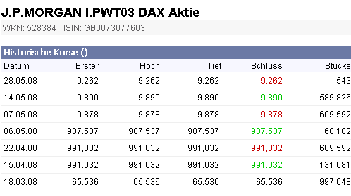 528384, die uns von ARIVA als "J.P.MORGAN I.PWT03 DAX Aktie" vorgestellt ist, dass ihr Curs vom DIENSTAG (15.4.2008) in Höhe von 991-TAUSEND-und-32 €uro schon am Tage ihrer nächsten Notierung, nämlich am DIENSTAG (22.4.2008) auf genau 991-COMMA-032 €uro einbricht, um dann am wiederum nächsten Notierungs-Tage, nämlich am DIENSTAG (6.5.2008), rasant auf stolze 987-TAUSEND-und-537 €uro förmlich zu EXPLODIEREN?