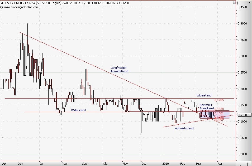 Die Konservative Bewertung zeigt zwei starke Widerstände, bei 0,13$ und bei 0,17$, ebenso eine starke Unterstützung bei 0,10$. Der langfristige Abwärtstrend wurde durch einen inzwischen stabilen Seitwärtstrend ersetzt. Um diesen zu brechen, bedarf es einer kräftige badnews oder goodnews, in die entsprechende Richtung wird der Chart sich dann bemühen.