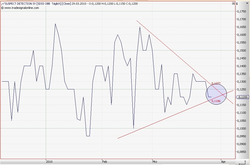 Mit der Ankündigung der Finanzberichte für den 31.03 hat sich am Seitwärtstrend nichts geändert. Der letzte Candle ist ein Dragonfly Doji (tonbo) nach einem deutlichen Kursverlust kam es zum intraday-reversal. Der gesamte Kursverlust wurde wieder aufgeholt. Dieser Doji im Abwärtstrend beendet sehr häufig diesen Trend und leitet eine Trendumkehr ein. Eine deutliche Verstärkung erhält diese Kerze durch einen relativ hohen Umsatz an diesem Tag (»Sell-Out«). Der Umsatz lag mit 66720 bei 70Mio shares im unteren Bereich, von sell out kann man da nicht reden. Nimmt man als Signalgeber die gesamte Formation der letzten 5 Candles kann man einen bullishen "doji star" (doji bike) erkennen, der könnte auch eine Trendumkehr vorhersagen. Im etablierten Abwärtstrend folgt auf eine lange schwarze Kerze ein Down-GAP mit einem völlig unentschiedenen Marktverlauf. Der doji sollte keine besonders langen Schatten haben. Nach Möglichkeit sollte der obere Schatten des doji nicht in den Körper des Vortags hineinreichen. Eine Bestätigung am Folgetag ist unbedingt abzuwarten! Als perfektes Zeichen kann man den letzten Doji für die Formation nicht bezeichnen, damit wird die Unentschlossenheit verstärkt.