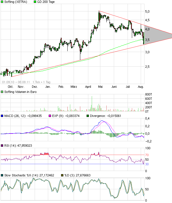 nicht schlecht machen, wäre ja auch überaus dämlich, da ich äußerst stark in dieser Aktie positioniert bin. Ich wollte nur ausdrücken, dass starke Zahlen und der Uptrend in diesem Umfeld der Angst keine Sicherheit bieten. Ich wäre froh und dankbar, wenn der Kurs sich jetzt langsam in Richtung des fairen Niveaus entwickeln würde. Falls es wider Erwarten noch einmal abwärts gehen sollte kaufe ich halt weiter nach. Das CRV ist hier momentan unglaublich gut. Solche schlimmen Wochen bieten ja auch außergewöhnliche Chancen. Softing hat zwar noch kein Drillisch Niveau von 2009, aber man kann bei diesen Kursen nicht mehr viel falsch machen.