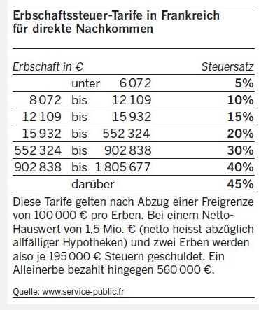 Besonders Frankreichs Erbschaftssteuern sind happig: Direkte Nachkommen müssen dem Staat bis zu 45% der Erbmasse abliefern (siehe Tabelle).
