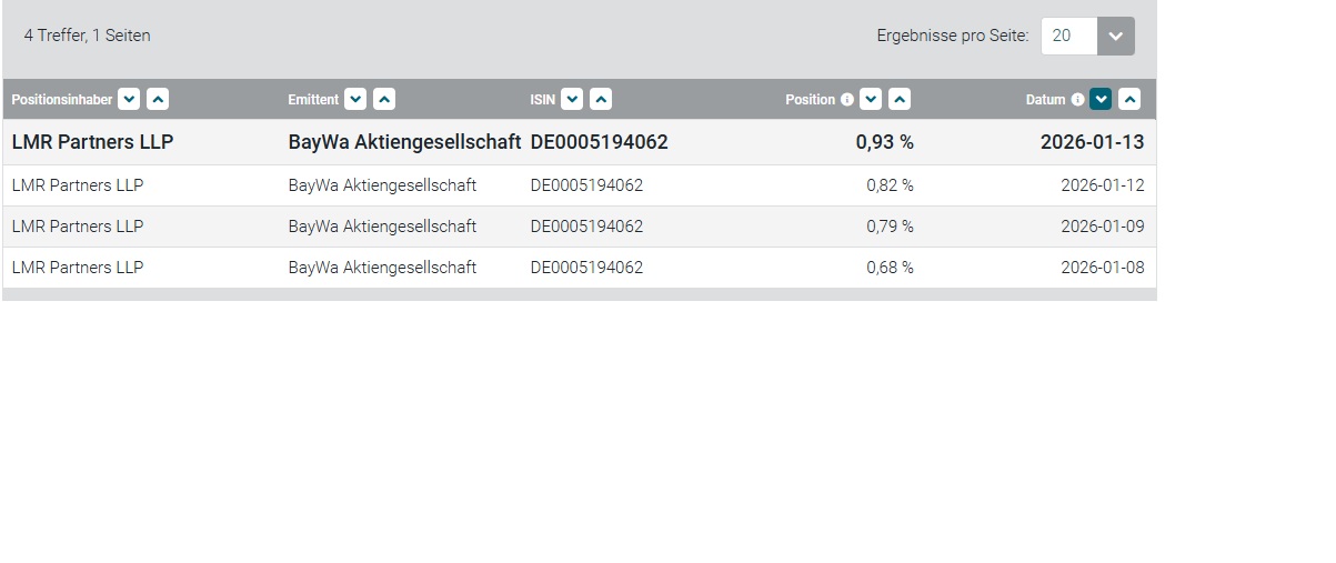 LMR Partners LLP hat seine Leerverkaufspositionen in den letzten Tag täglich nach oben geschraubt - trotzdem ist die Aktie im gleichen Zeitraum kräftig gestiegen. Das sieht gut aus. LMR Partners LLP hat nun knapp 1% aller BayWa-Aktien leerverkauft. Mal schauen, wann die Aktien zur Glattstellung der Position wieder eingekauft werden.