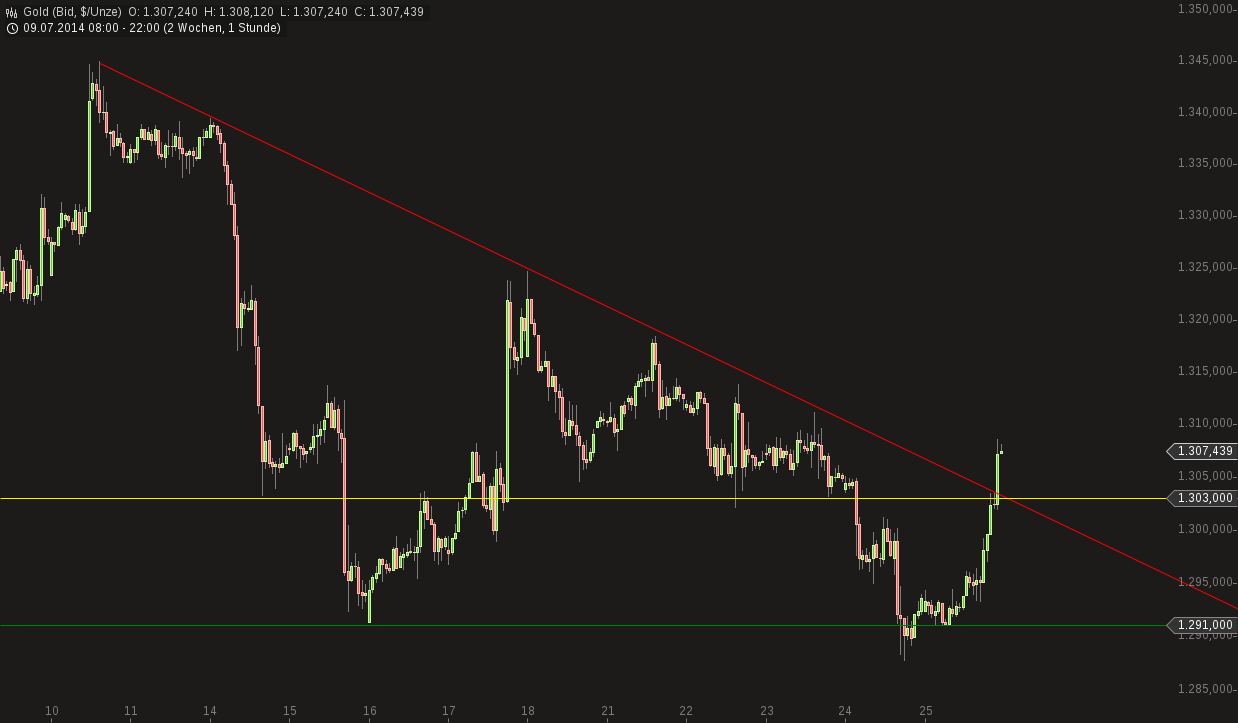 Heute Morgen, kurz nach 7 Uhr liegt der Kurs um die 1.296-97 $. Die Frage ist, ob die 1.291$ von letzter Woche womöglich noch einmal getestet werden.