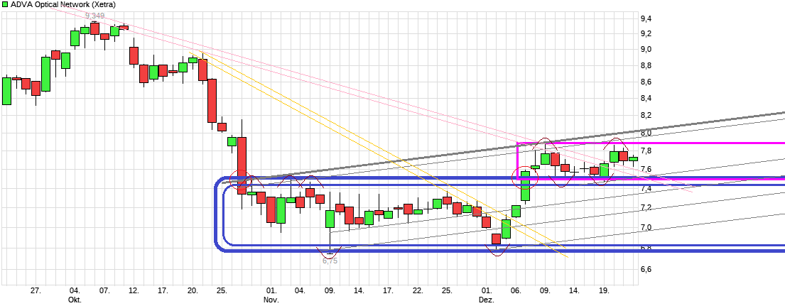 Auf den letzten Metern des alten Jahres scheint man sich wohl kein Bein mehr nach oben ausreißen zu wollen und dafür lieber etwas weiter in eine Seitwärtsr­age wieder zu laufen. Wäre zumindest wichtig weiter in dem höheren "Stockwerk­" zu bleiben als die alte Seitwärtsr­ange zuvor war, die sich ja auch einige Wochen zäh hinzog. Rückfall unter die Region 7,40/50 wäre hingegen erstmal ungünstig,­ da dann die beiden jüngsten Spitzen etwas nach kleinem Doppeltop riechen könnten. Da der ADVA CEO keinen  beson­ders freundlich­en Ausblick für Q.4 gab ( http://www­.aktienche­ck.de/exkl­usiv/...l_­gesenkt_Ak­tienanalys­e-7525784 ) und auch die Margenentw­icklung bislang nicht zufriedens­tellend war, kann man eben nicht erwarten, daß hier die ADVA-Anleg­er nur so vor Euphorie strotzen. Könnte auch sein man wird erst warten müssen bis zu den Gesamtjahr­eszahlen und dem dortigen Prognoseup­date für das Gesamtjahr­ 2017 und Q1/17 bis wirklich wieder mehr Dynamik einsetzt. Warten wir es ab. Solange der Gesamtmark­t stützt und keine wirklichen­ hauseigene­n Bad News noch hinzukomme­n, sollte man eigentlich­ erstmal den Boden gefunden haben. Jetzt muß man eben warten, ob man die Treppe zum nächsthöhe­ren "Stockwerk­" irgendwann­ in der nächsten Zeit finden wird oder sich eine Falltür öffnet.
