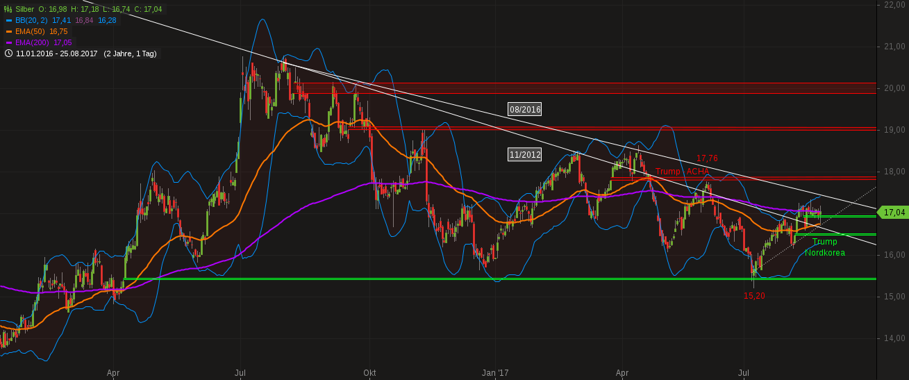 Abgeblockt von der EMA 200 und unterstützt vom grünen Fenster (15.8.2017) war Silber in dieser Woche in eine schmalbandige Seitwärtsbewegung getrieben worden, aus der es nur intraday mal einen Blick darüber hinaus, mal hinauf, mal hinunter, wagte. Die für den Freitag eingestellten Jacksonhole-Orders zerrten dann erneut am Edelmetall, mal hinauf, mal hinunter, dieses Mal heftiger. Doch nach unten war an der EMA 50 sowie der Aufwärtstrendlinie 07.07.2017 bzw. der pullback-Abwärtstrendlinie 11/2012 Endstation, einem Dreierpack, welches als unüberwindbare Kreuzunterstützung den Bären im Wege stand; und nach oben ging es auch nicht viel höher rauf als an den Vortagen.
