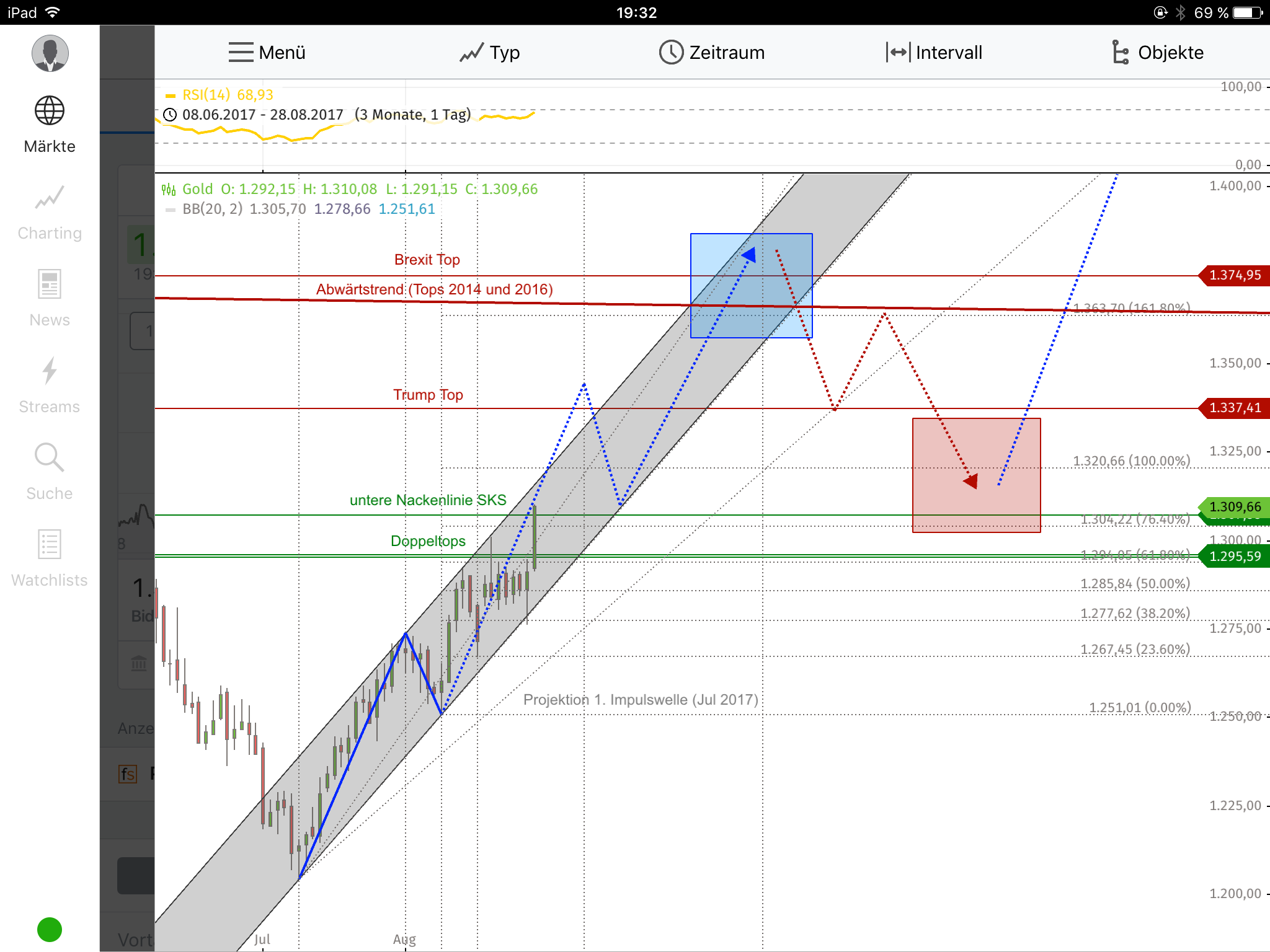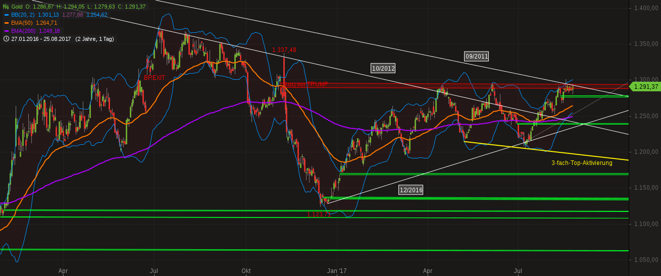 USD 1.239 (Schlusskurs) am Fr, 1.9.2017 und die Aufwärtstrendlinie 12/2016 im Wochenchart bleibt unbeschädigt. Hier müssten 3 Widerstände + eine 3-fach-Kreuzunterstützung durchschlagen werden.