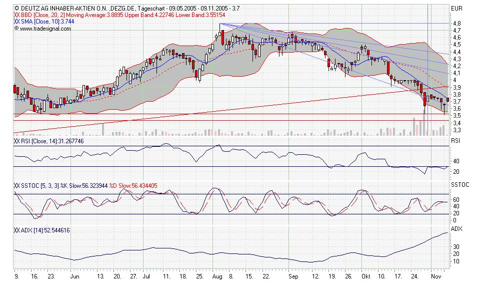 Also Tradingbuy war wohl eine etwas "falsche" Ausdrucksweise heute Mittag! Klar freu ich mich, wenn es zur W-Bildung kommt und wir schnell nen paar Prozente gut machen aber Deutz kann man m.M. nach auch durchaus langfristig sehen. Wie ihr im anhängenden Chart seht, hat Deutz an einer sehr wichtigen Unterstützung einen Doppelboden gebildet. Heute wäre bei 3,78 € (was mein Kaufkurs war *gg*) fast der Ausbruch und die Vollendung der W-Formation geschehen aber diese 3,78 € haben sich als hartnäckiger dargestellt, als ich dachte und zum Handelsende wurde das schöne Plus fast aufgebraucht Bodenbildung ja, aber der Markt ist sich noch nicht ganz einig wie´s weitergeht mal den morgigen Handelsverlauf beobachten.
