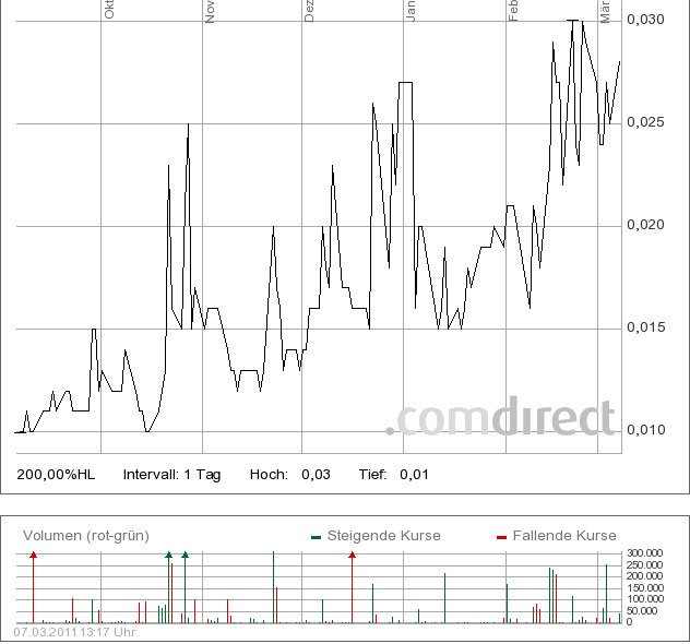 heute. Es wäre schön, wenn der Trend endlich nach oben zeigen würde. Lange genug dümpelte der Kurs ja unter 2 Cent.