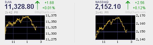 The Dow Jones industrial average rose 96.86 points to close at 11,327.12, its best close in three months. The Dow has gone up nearly 229 points in two days.