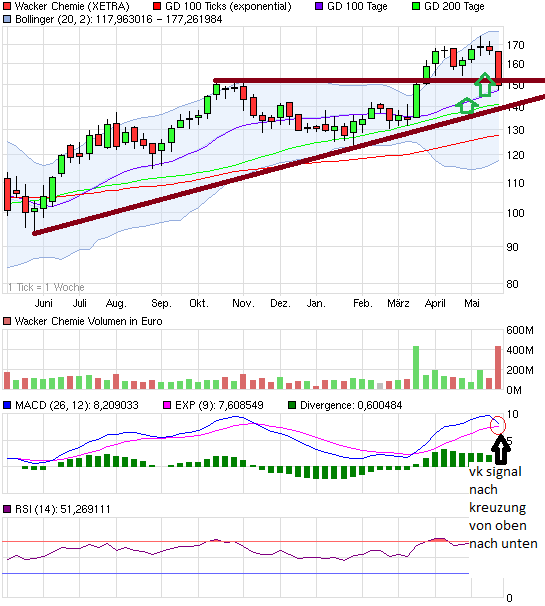 Nimmt man aber den Aufwaertstrend vom Mai 10 waere nach unten noch Platz bis ca. 140 Euro, der MACD wuerde diese Variante eigentlich auch bestaetigen da demnaechst wohl ein VK Signal ansteht sollte der Kurs noch weiterfallen. (Chart 2)
