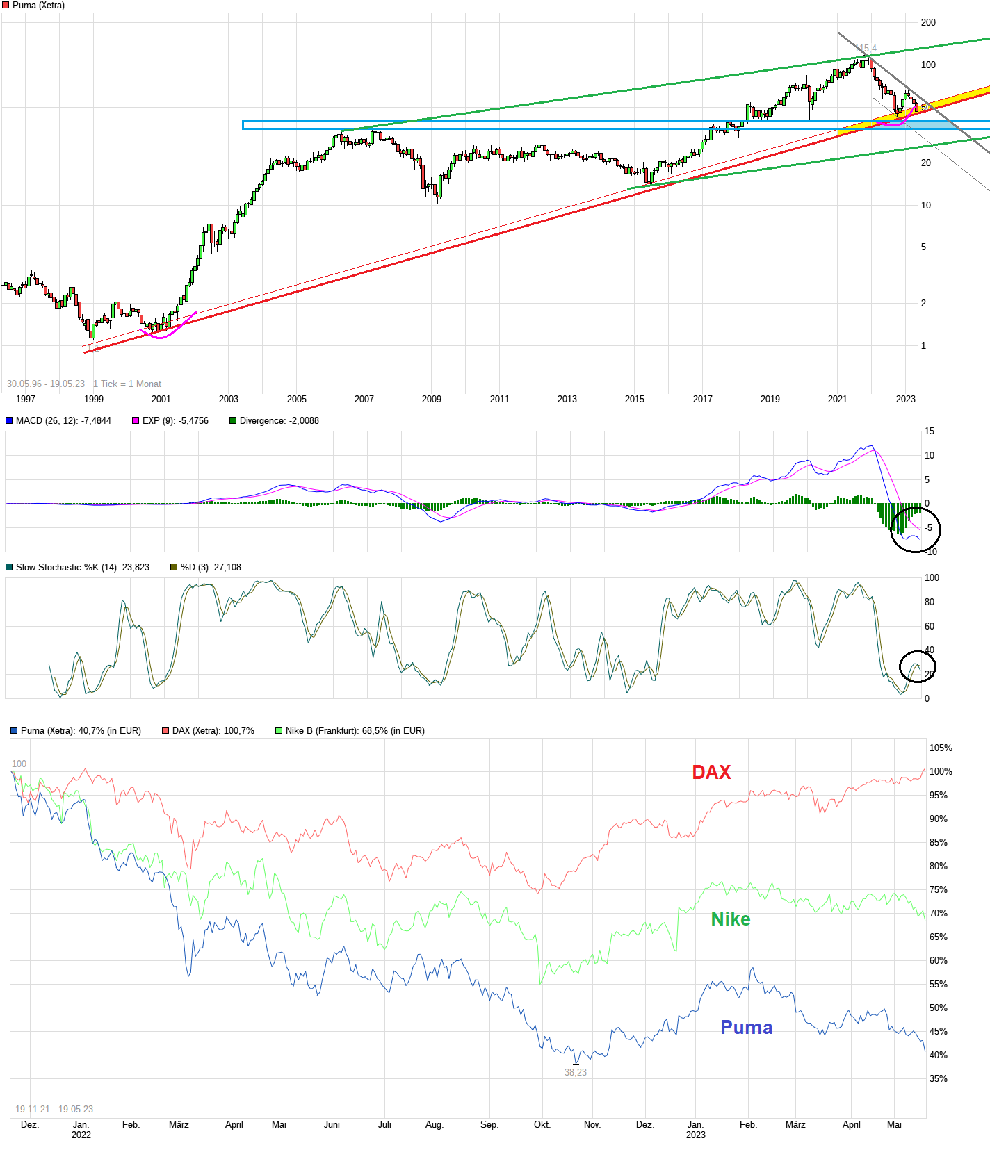 Der Kursverfall des Gesamtmarkt -und Branchenunderperformers Puma geht stetig weiter. Man bekommt langsam das ungute Gefühl hier geht es in der nächsten Zeit vielleicht sogar runter in Richtung der Region 39/41, d.h. in eine Region wo man letzten Herbst auch schon war. Wichtig wäre dann wieder die Region 39/40 nicht nach unten zu verlassen, da sich sonst eine große SKS ausbilden würde, was nochmal weitere Verkaufssignale senden würde. Also wenn die jüngsten News von Foot Locker ( =>19.05.2023 Auch das noch: Foot Locker grätscht in Puma und Adidas https://www.deraktionaer.de/artikel/...-puma-und-adidas-20332366.html "...Die Papiere von Adidas und Puma stehen mit weitem Abstand am HDAX-Ende. Der Grund ist in den USA zu suchen, wo der Sportschuh- und Sneaker-Händler Foot Locker eine Umsatzwarnung ausgesprochen hat. Aus technischer Sicht herrscht vor allem beim MDAX-Wert Puma die Alarmstufe Rot. Adidas hält sich noch vergleichsweise gut...") Zeichen sind was in der Sportartikel-Branche weiterhin los ist, dann ist hier wohl so schnell keine größere Umkehr nach oben zu erwarten.