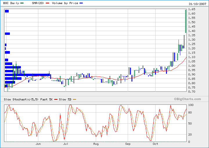 Seriöses Research als Pusherei zu bezeichnen ist also vollkommener Nonsens. Mittlerweile ist ja auch jeder BOC Aktionär im +,diejenigen die bei der Publikation der Swen Lorenz Studie im Dez 04 sofort zugegriffen haben (0,22€) sogar schon komfortable 300%.Das dürfte so manchem Kritiker den Wind aus den Segeln nehmen ;-)))