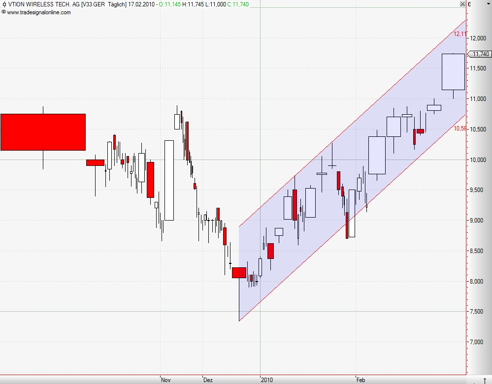Wie gesagt, man sollte die Trendkanäle nur nutzen, wenn es auch entsprechend viele bestätigende Punkte gibt, also unten und oebn jeweils mindestens 3. Das gilt für normale Trends genauso. Als Orientierung kann man sich ja gerne diese Trends und Kanäle einzeichnen, aber bitte nicht danach chartanalytisch handeln!