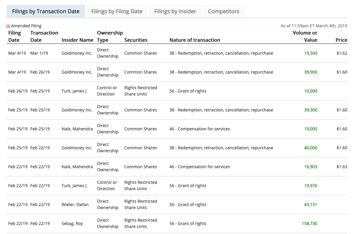 Goldmoney hat beim damaligen Post über den Aktienrückkauf angegeben, dass sie aufgrund des Volumens an der TSX nur bis zu 40k Aktien pro Tag einkaufen dürfen. Aus diesem Grund gibt es auch immer nur die Limitierung von <40k Aktien wie bspw. am 26.02.19. Fakt ist auf jeden Fall, dass die Anteile der Insider immer höher wird und *niemand* von den Insindern verkauft hat. Wie das zu werten ist überlasse ich jedem selbst.