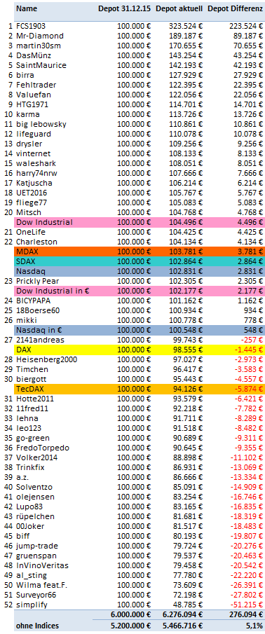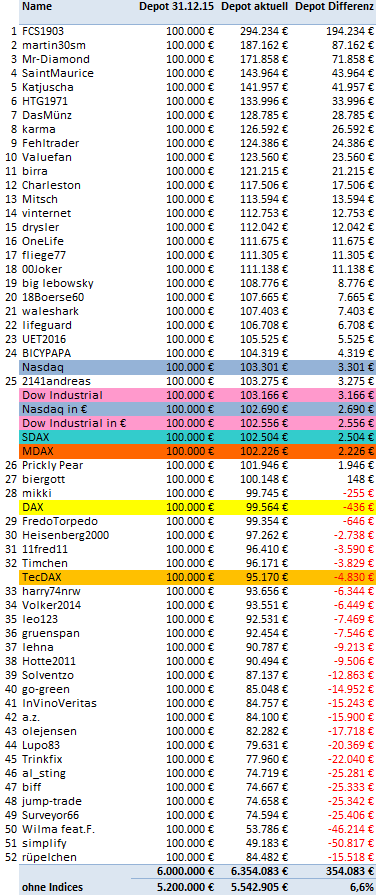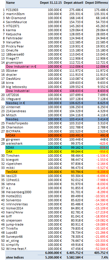 Der Durchschnitt über alle Depots liegt mit 7,4% im Plus - hätte man da ein Wikifolio draus gemacht, hätte es sich ganz gut geschlagen und das ohne einen Kauf oder Verkauf das ganze Jahr über.