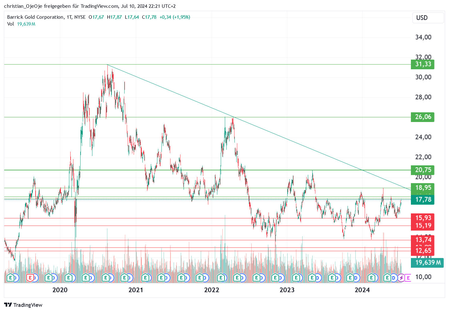 sollte nun gebrochen werden um den Seitwärtstrend zu verlassen. Der nächste Wiederstand liegt dann bei 20$, aktuell sieht es gut aus für Barrick Gold. Der Kurs läuft in die richtige Richtung, für Bären keine gute Zeit.