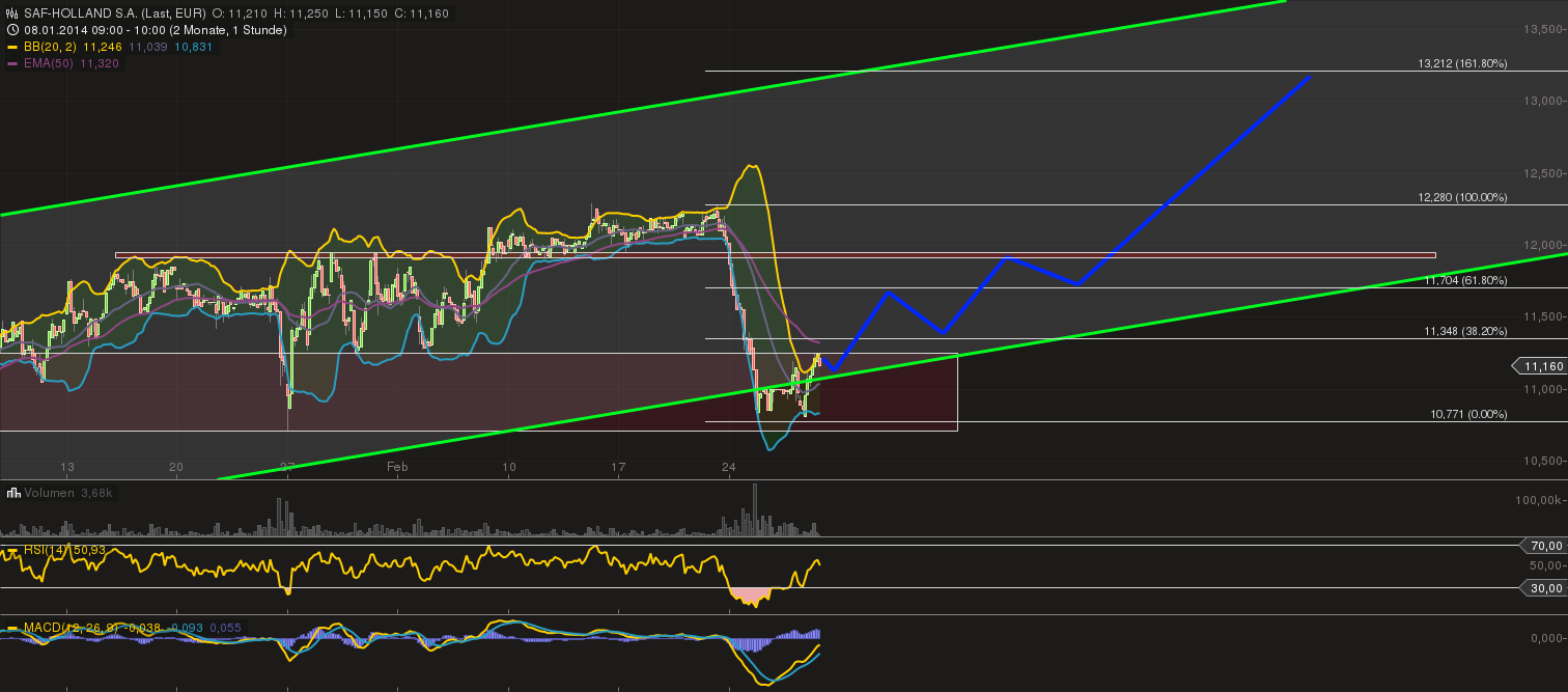 Für das laufende Jahr peilt die Gesellschaft mit rechtlichem Sitz in Luxemburg Erlöse in einer Bandbreite von 920 bis 945 Mio. Euro an. Beim bereinigten EBIT geht SAF-Holland von etwa 70 Mio. Euro aus. Demnach liegt das Umsatzziel leicht unterhalb der Erwartungen, während die Gewinnprognose etwas besser ausfällt als gedacht. "Durch die Ende 2013 anziehende Nachfrage besonders in Europa konnten wir gut in das Geschäftsjahr 2014 starten. Gleichzeitig konnte sich SAF-Holland in Nordamerika behaupten. In den beiden Kernmärkten freuen wir uns über gut gefüllte Auftragsbücher", sagt Borghardt. Für die Aktie sollten damit wieder bessere Zeiten anbrechen. Gemessen am Börsenwert von gut 475 Mio. Euro bekommen Anleger eine Menge Gegenwert. Der Titel gehört zu den günstigsten Zulieferaktien. Dennoch eignet sich das Papier nur für risikobereite Anleger. Erfahrungsgemäß schwankt der Kurs der SAF-Aktie stärker als der von vergleichbaren Unternehmen. Rein charttechnisch ist es ein positives Zeichen, dass die Notiz bei 10 Euro wieder nach oben gedreht hat.