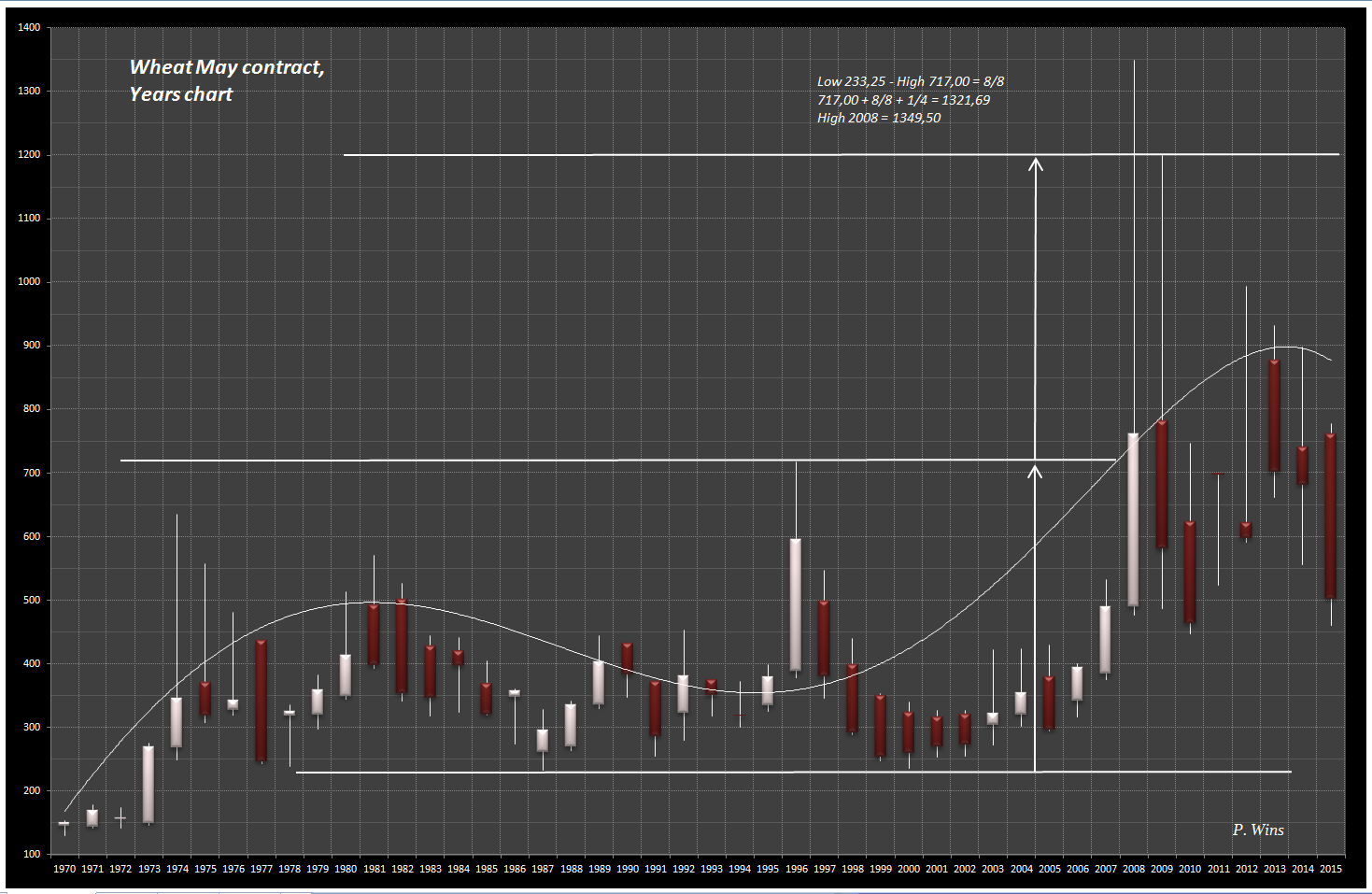 Anbei sein Master 12 Chart für Weizen. Den habe ich so weit übernommen und ab den 50er Jahren mit markanten Hochs und Tiefs ergenzt. Wir sind in 2016: it is a time for a bottom