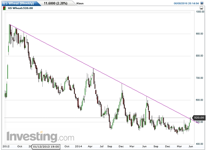 Letzter markanter Tief lag im Mai 1987 Kontrakt bei 233 1/4 US cent (abgesehen von 70er Jahren letzten Jahrhundert). 2008 und 2009 war auch eine Übertreibung nach oben, die bis jetzt sich rächt. Über Jahrzente hinaus notierte Weizen zw. 200 und 700. Warum soll Preis jetzt nicht wieder in diesem Bereich notieren?